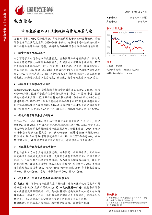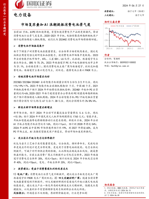 【国联证券】【20240627】电力设备行业专题研究:市场复苏叠加AI浪潮提振消费电池景气度-14页