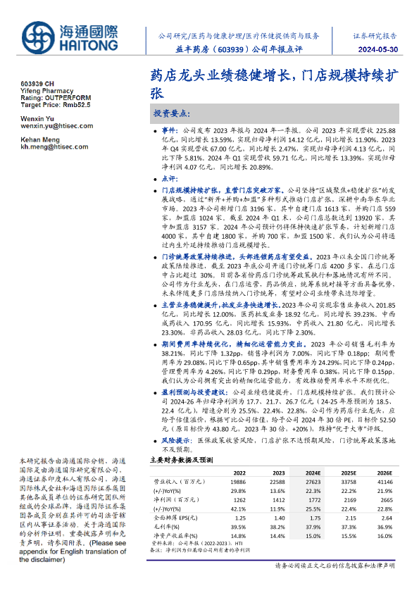 【海通国际】【20240530】益丰药房-603939.SH-公司年报点评:药店龙头业绩稳健增长,门店规模持续扩张-11页