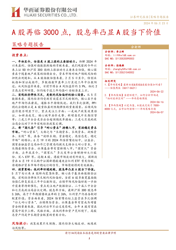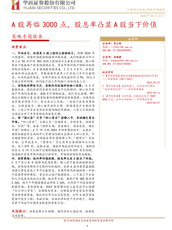 【华西证券】【20240623】策略专题报告:A股再临3000点,股息率凸显A股当下价值-10页