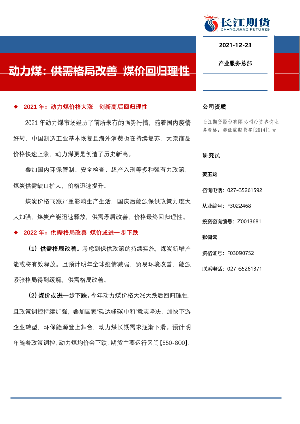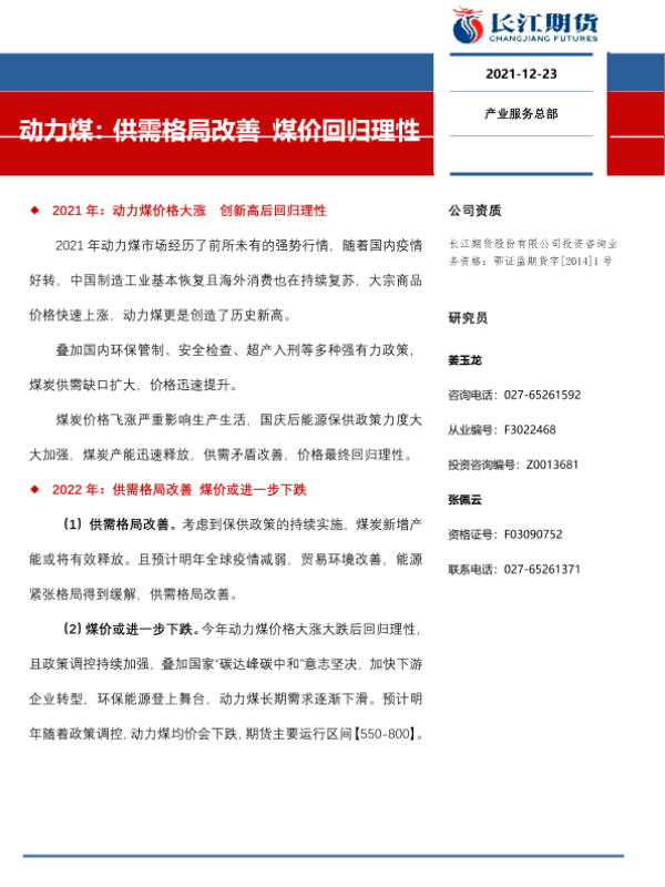 【长江期货】【20211223】动力煤专项报告:供需格局改善,煤价回归理性-15页
