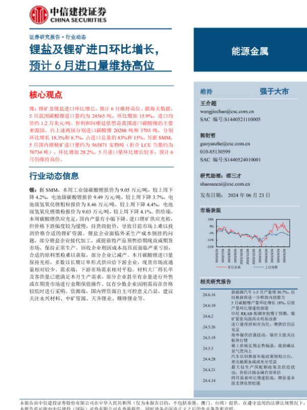 【中信建投证券】【20240623】能源金属行业:锂盐及锂矿进口环比增长,预计6月进口量维持高位-12页