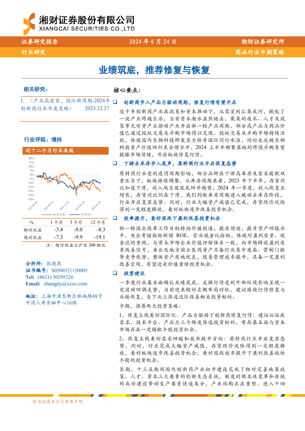【湘财证券】【20240624】药品行业中期策略:业绩筑底,推荐修复与恢复-29页