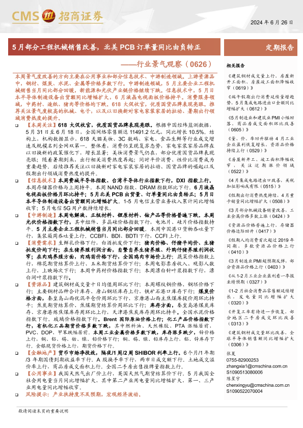 【海通证券】【20240626】行业景气观察:5月部分工程机械销售改善,北美PCB订单量同比由负转正-33页