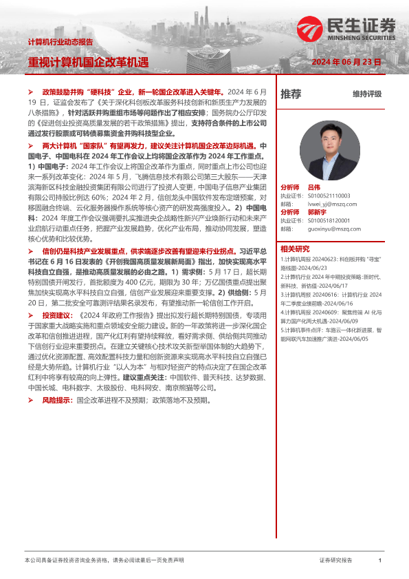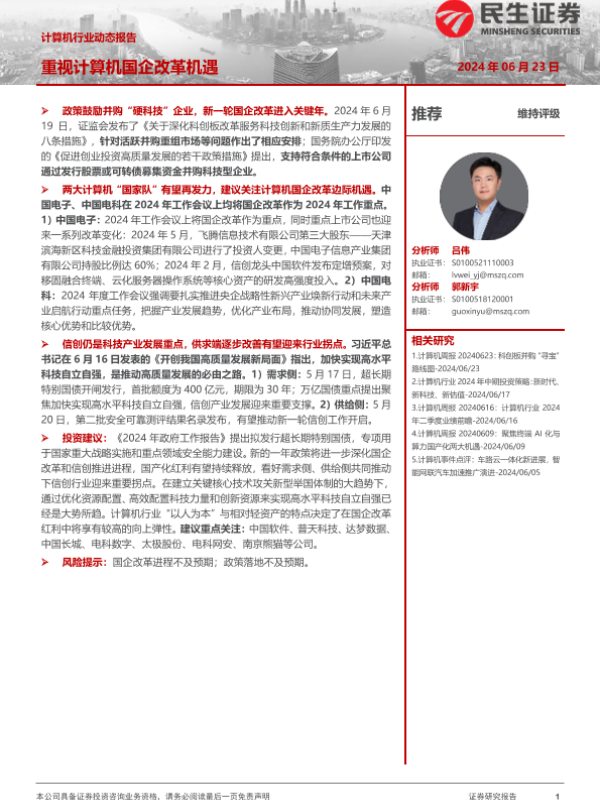 【民生证券】【20240623】计算机行业动态报告:重视计算机国企改革机遇-17页