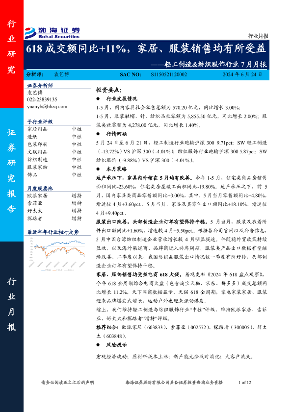 【渤海证券】【20240624】轻工制造&纺织服饰行业7月月报:618成交额同比+11%,家居、服装销售均有所受益-12页