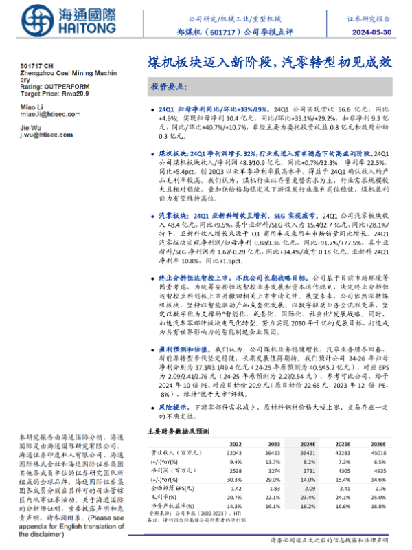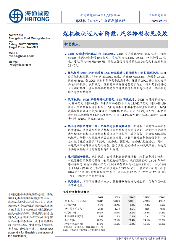 【海通国际】【20240530】郑煤机-601717.SH-公司季报点评:煤机板块迈入新阶段,汽零转型初见成效-11页