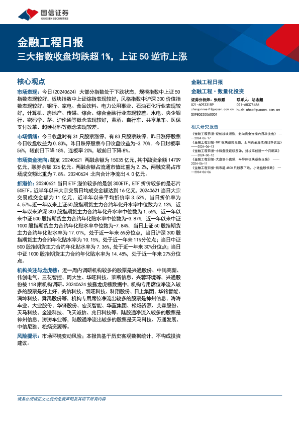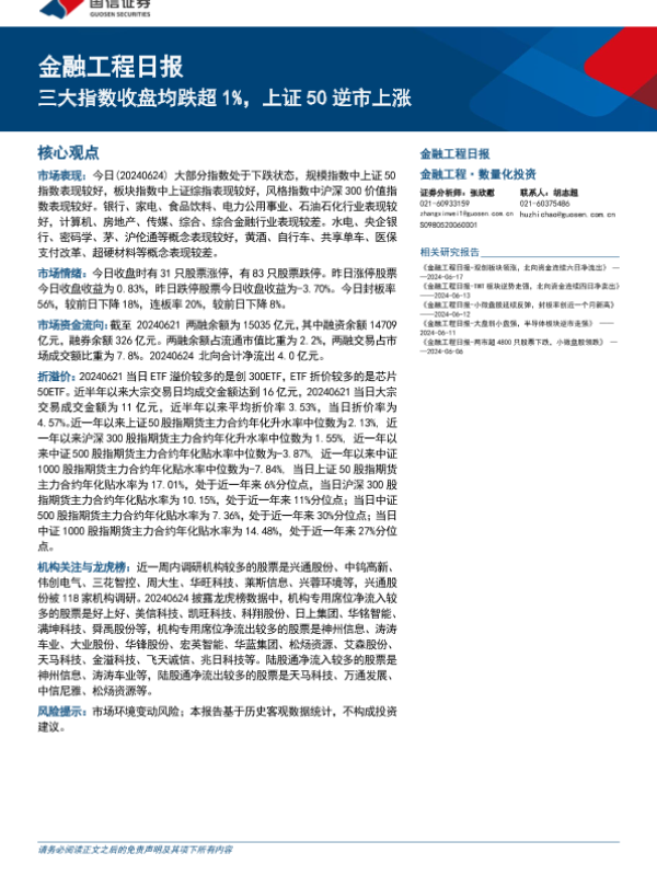 【国信证券】【20240624】金融工程:三大指数收盘均跌超1%,上证50逆市上涨-15页