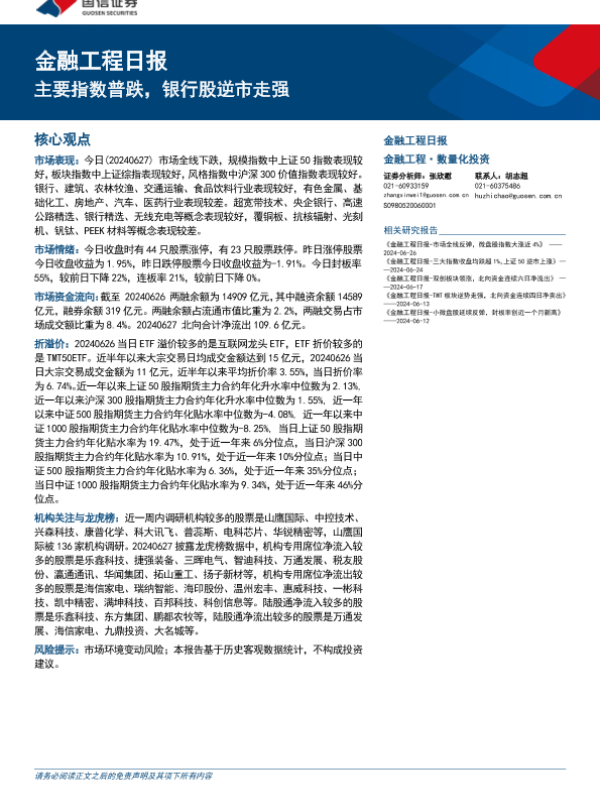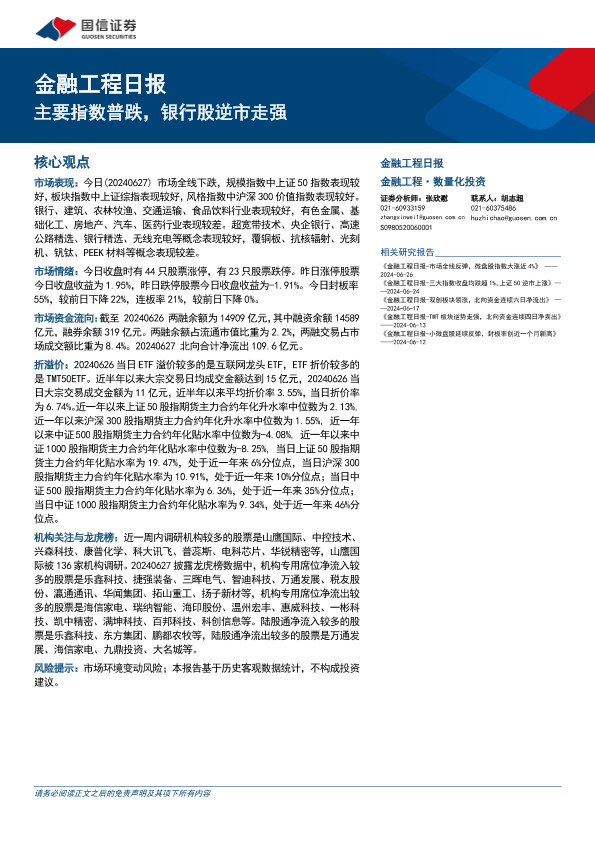 【国信证券】【20240627】金融工程:主要指数普跌,银行股逆市走强-15页