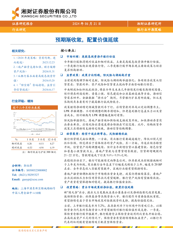 【湘财证券】【20240621】银行业中期策略:预期渐收敛,配置价值延续-28页