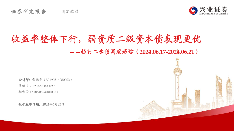 【兴业证券】【20240623】银行二永债跟踪:收益率整体下行,弱资质二级资本债表现更优-40页
