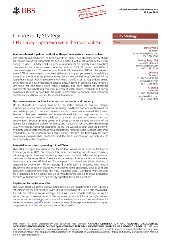 【UBS Securities Asia Limited】【20240617】UBS Equities-China Equity Strategy _CFO survey - upstream seem the most upbeat-18页