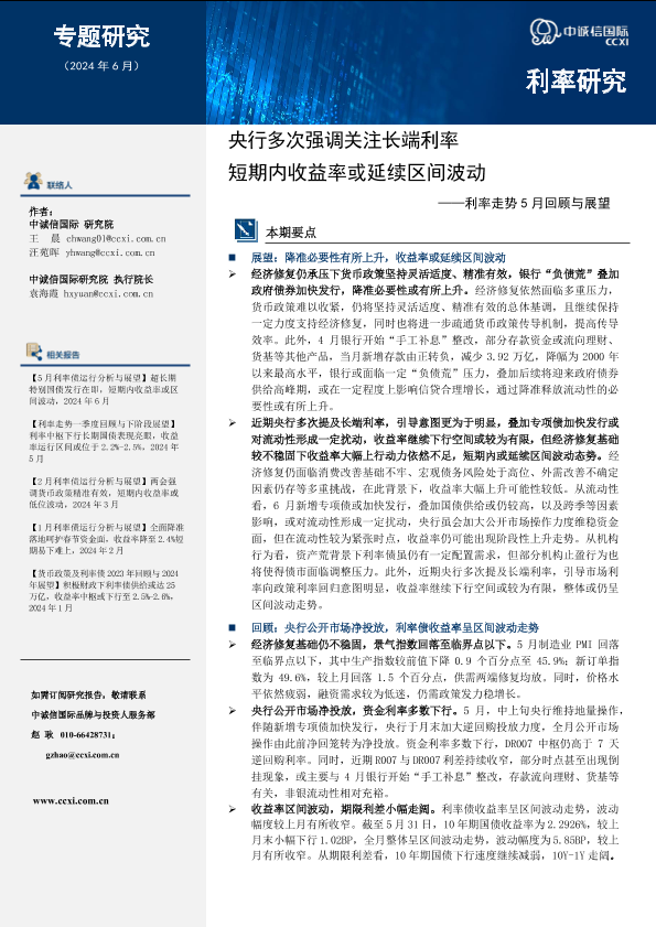 【中诚信国际】【20240601】央行多次强调关注长端利率,短期内收益率或延续区间波动-10页
