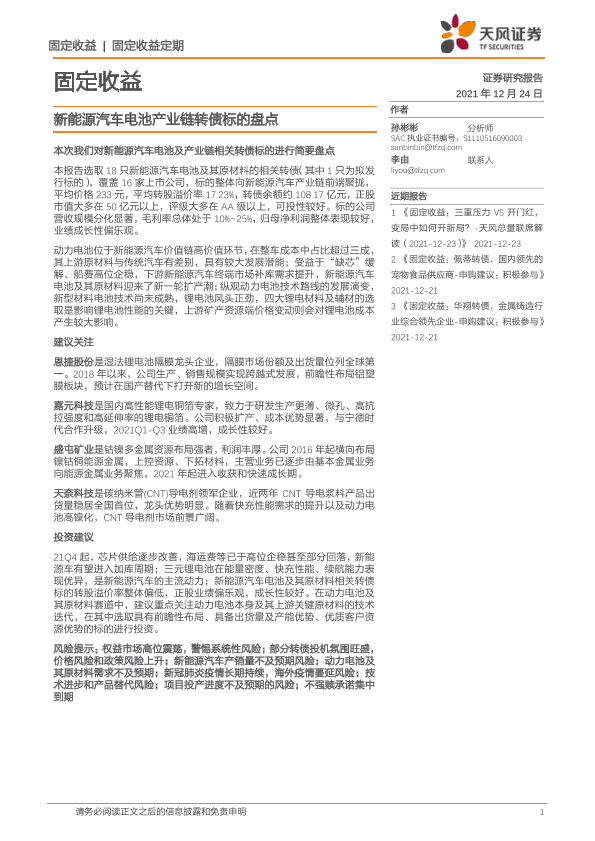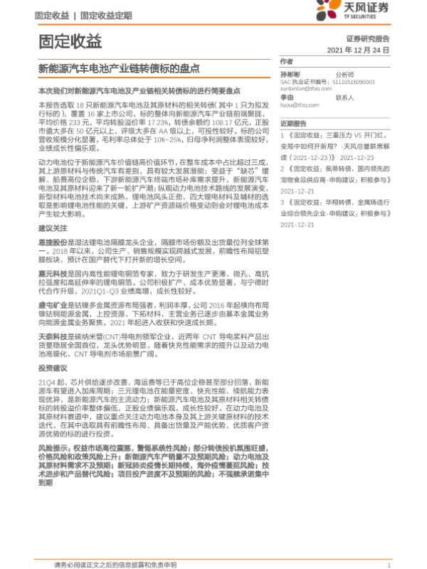 【天风证券】【20211224】固定收益:新能源汽车电池产业链转债标的盘点-23页