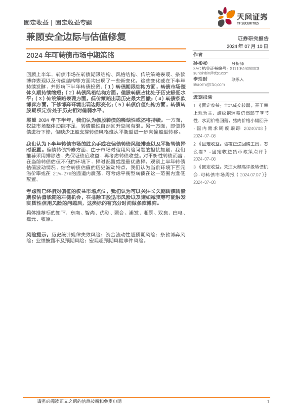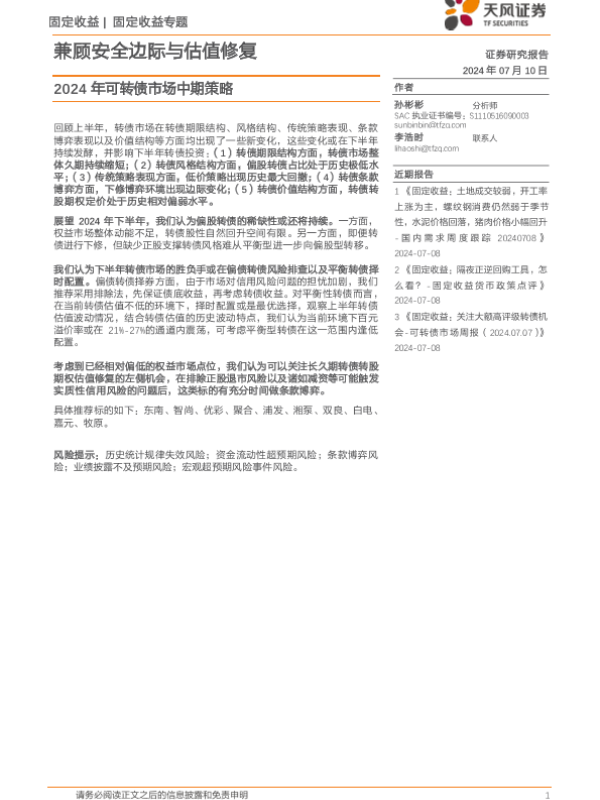 【天风证券】【20240710】2024年可转债市场中期策略:兼顾安全边际与估值修复-12页