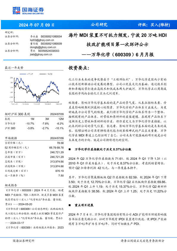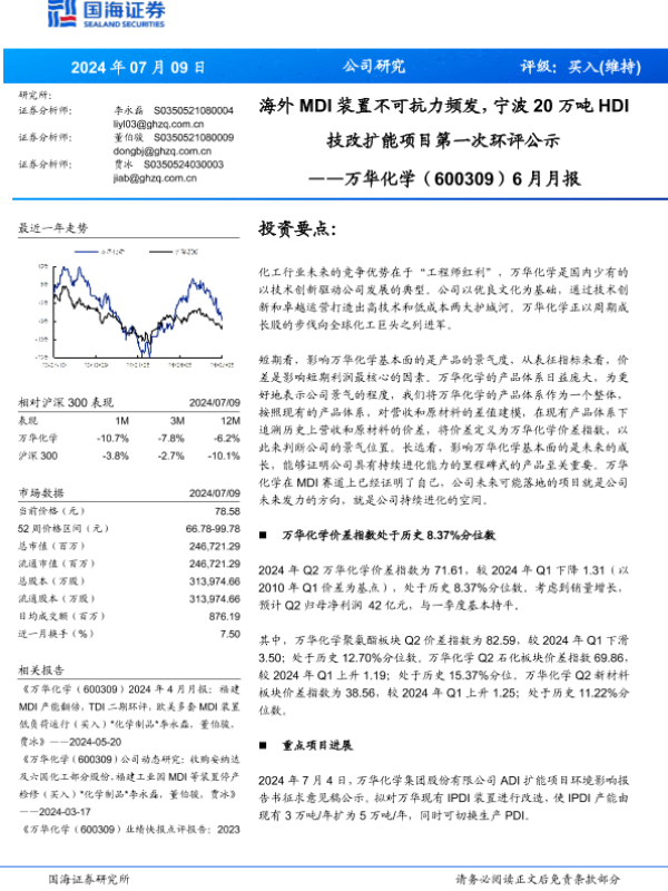 【国海证券】【20240709】万华化学(600309)6月月报:海外MDI装置不可抗力频发,宁波20万吨HDI技改扩能项目第一次环评公示-38页
