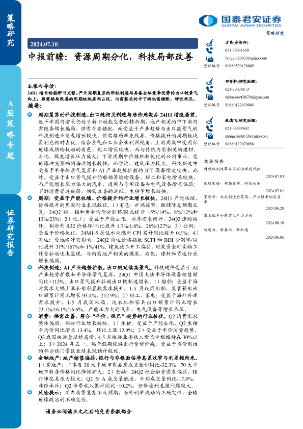 【国泰君安证券】【20240710】中报前瞻:资源周期分化,科技局部改善-14页