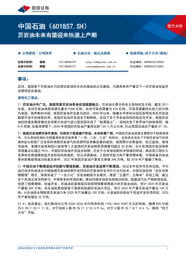 中国石油 产量预测 技术突破 能源独立 页岩油