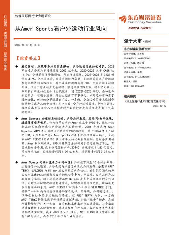 【东方财富证券】【20240708】传媒互联网行业专题研究:从Amer Sports看户外运动行业风向-22页