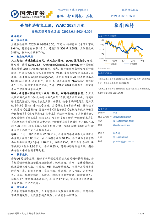 【国元证券】【20240705】传媒互联网行业月报:暑期新游密集上线,WAIC+2024开幕-30页