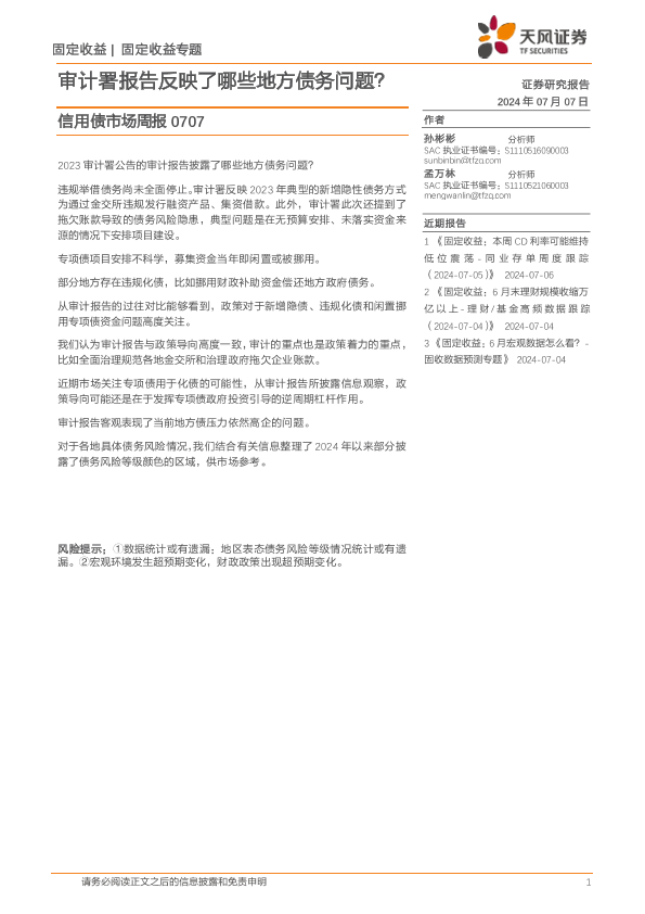 【天风证券】【20240707】信用债市场:审计署报告反映了哪些地方债务问题?-13页