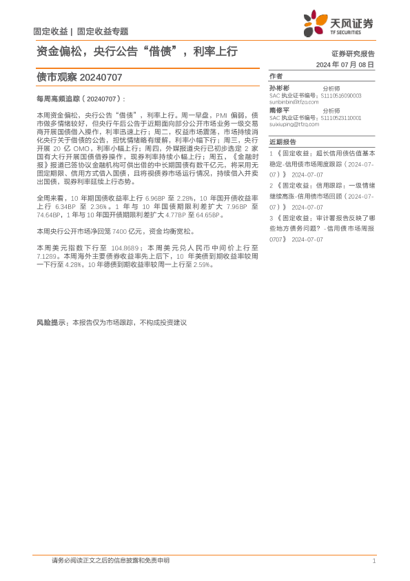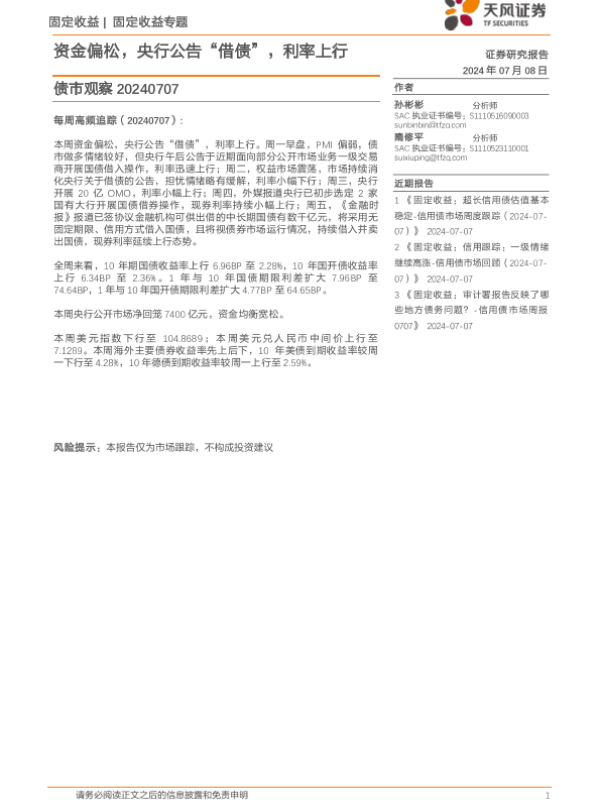 【天风证券】【20240708】债市观察:资金偏松,央行公告“借债”,利率上行-10页