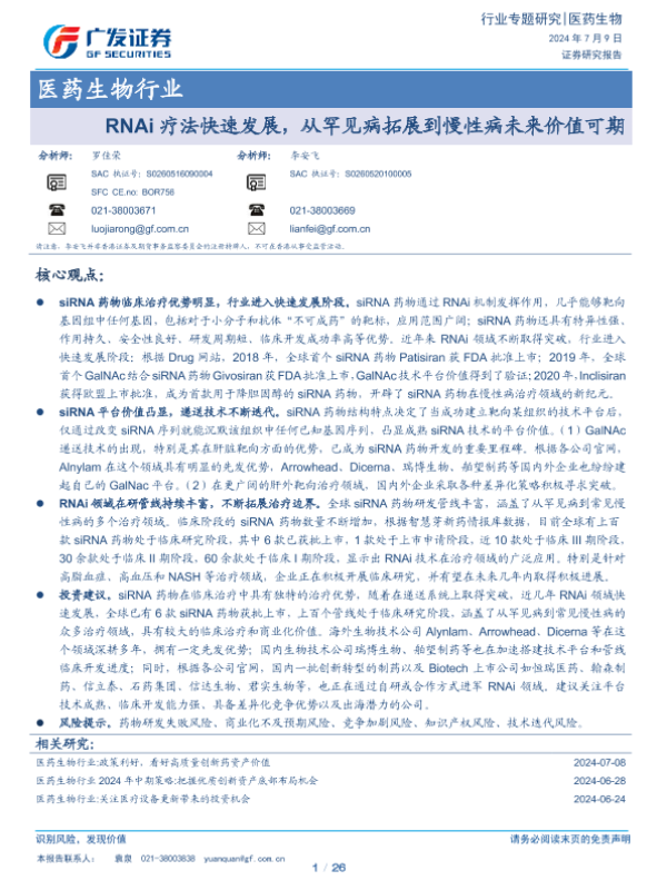 【广发证券】【20240709】医药生物行业:RNAi疗法快速发展,从罕见病拓展到慢性病未来价值可期-26页