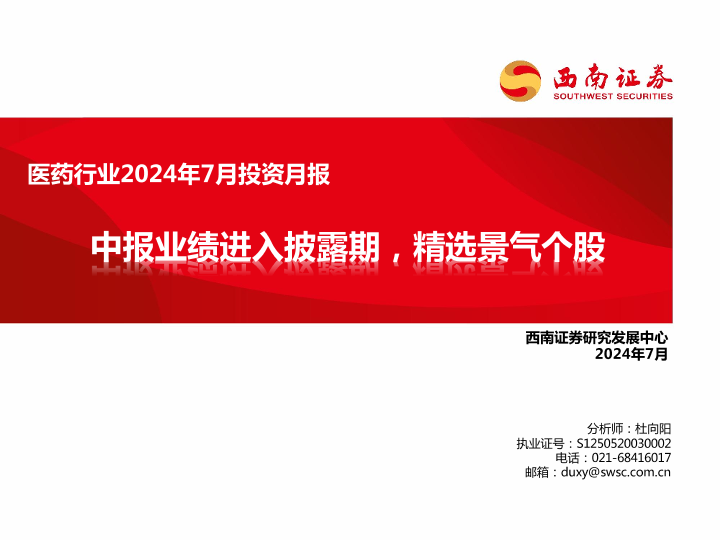 【西南证券】【20240707】医药行业2024年7月投资月报:中报业绩进入披露期,精选景气个股-84页