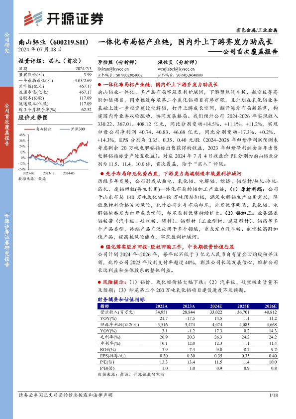 【开源证券】【20240708】南山铝业(600219)公司首次覆盖报告:一体化布局铝产业链,国内外上下游齐发力助成长-18页