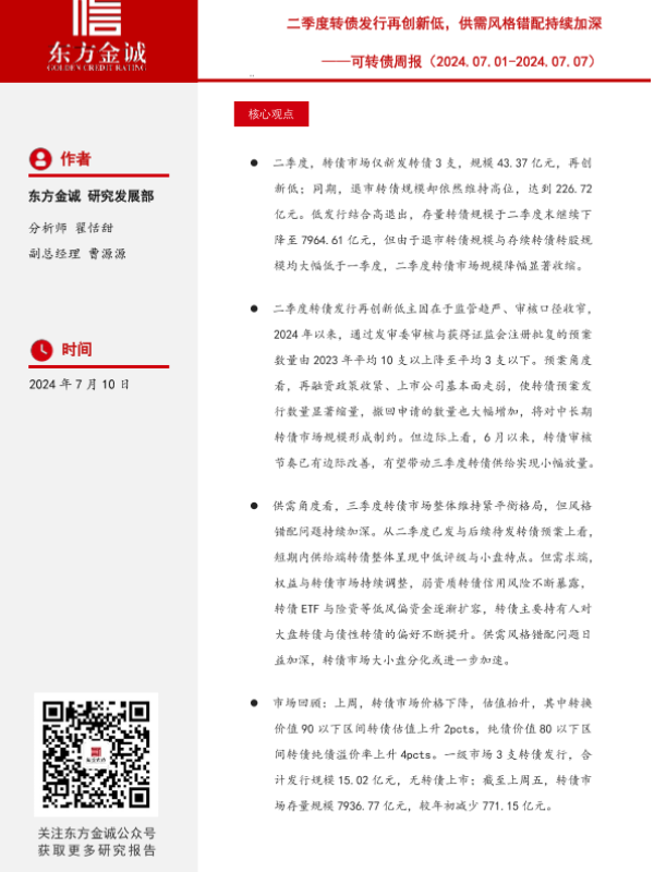 【东方金诚】【20240710】二季度转债发行再创新低,供需风格错配持续加深-12页