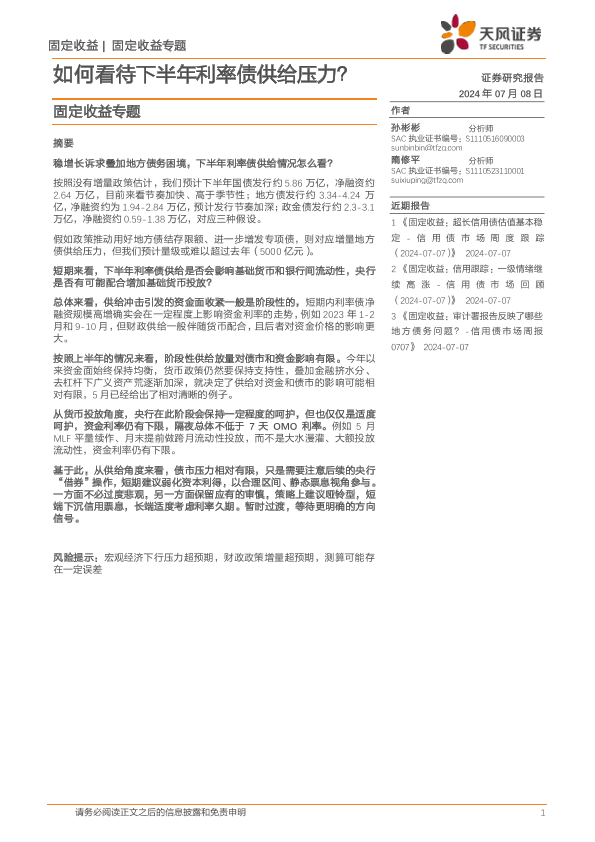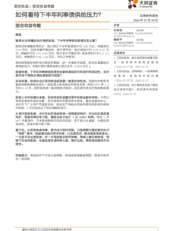 【天风证券】【20240708】固定收益专题:如何看待下半年利率债供给压力?-13页