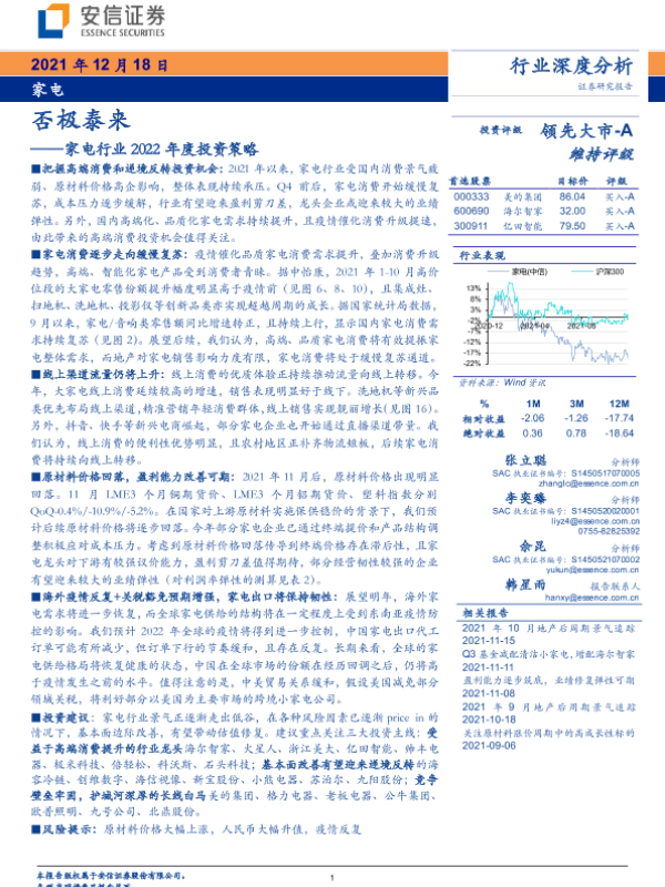【安信证券】【20211218】家电行业2022年度投资策略:否极泰来-25页