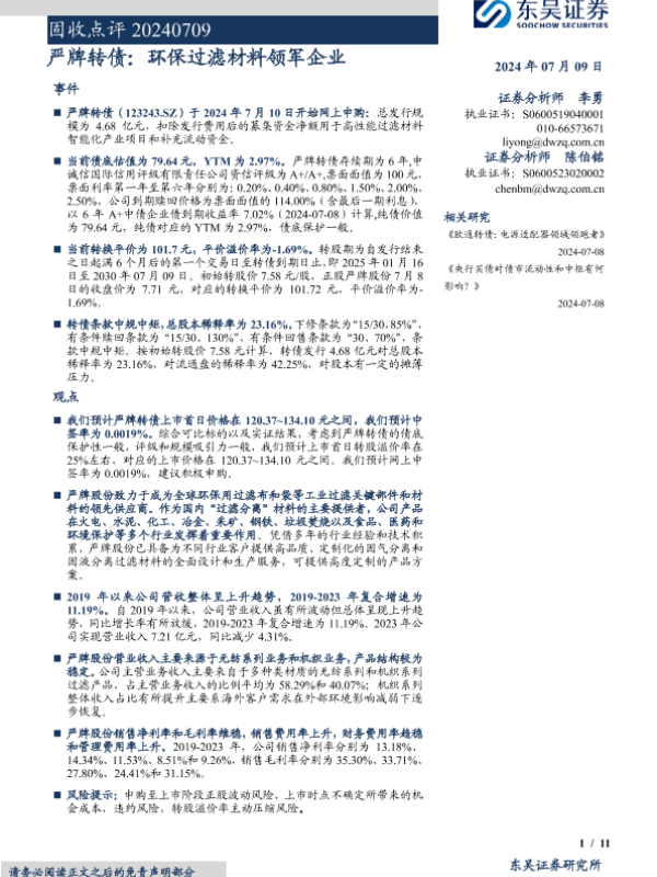 【东吴证券】【20240709】固收点评:严牌转债,环保过滤材料领军企业-11页