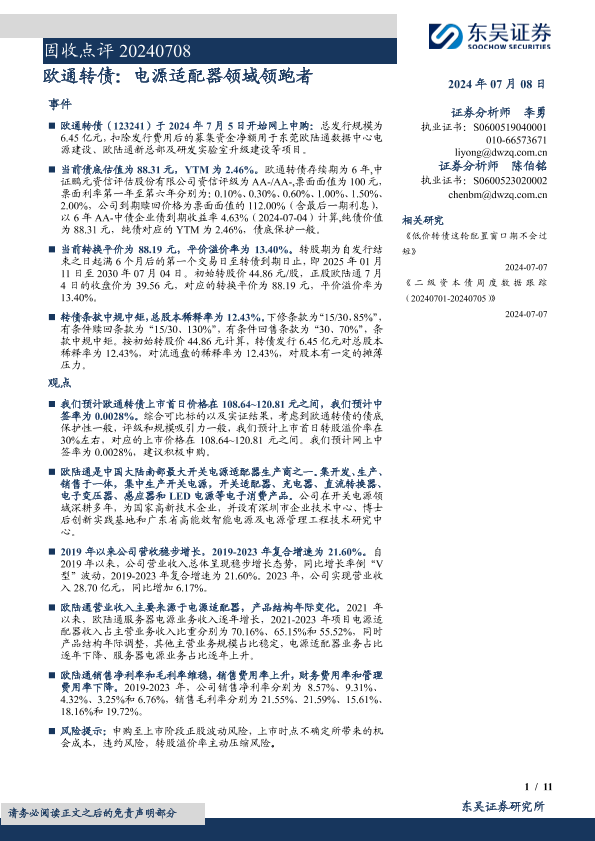 【东吴证券】【20240708】固收点评:欧通转债,电源适配器领域领跑者-11页
