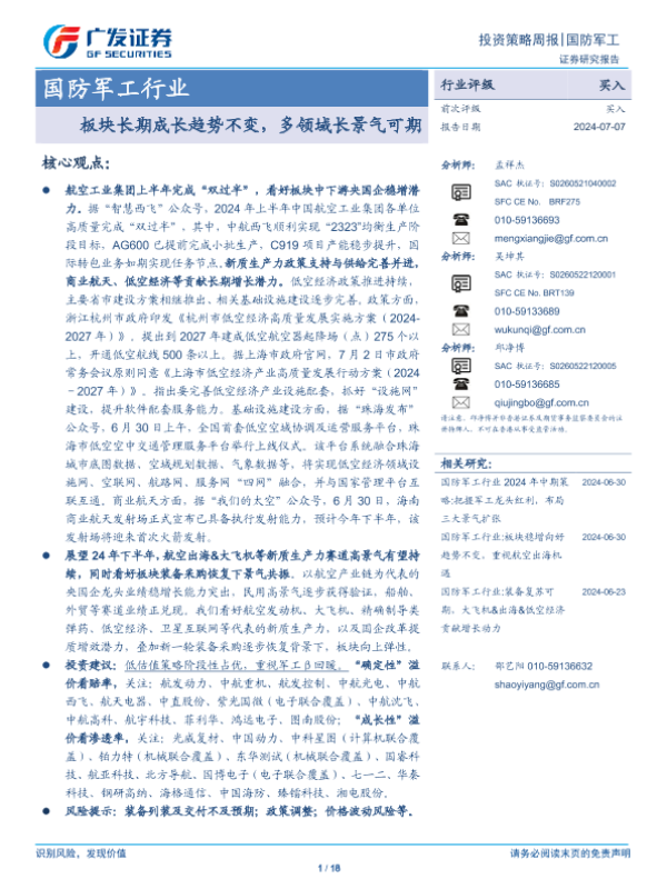 【广发证券】【20240707】国防军工行业:板块长期成长趋势不变,多领域长景气可期-18页