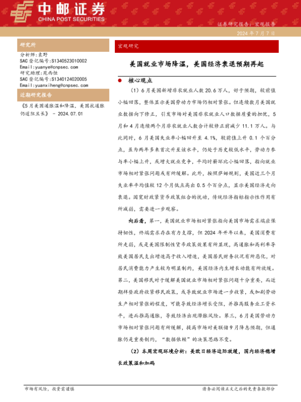 【中邮证券】【20240707】宏观研究:美国就业市场降温,美国经济衰退预期再起-35页