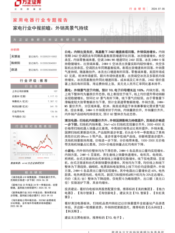 【方正证券】【20240705】家用电器行业专题报告-家电行业中报前瞻:外销高景气持续-23页