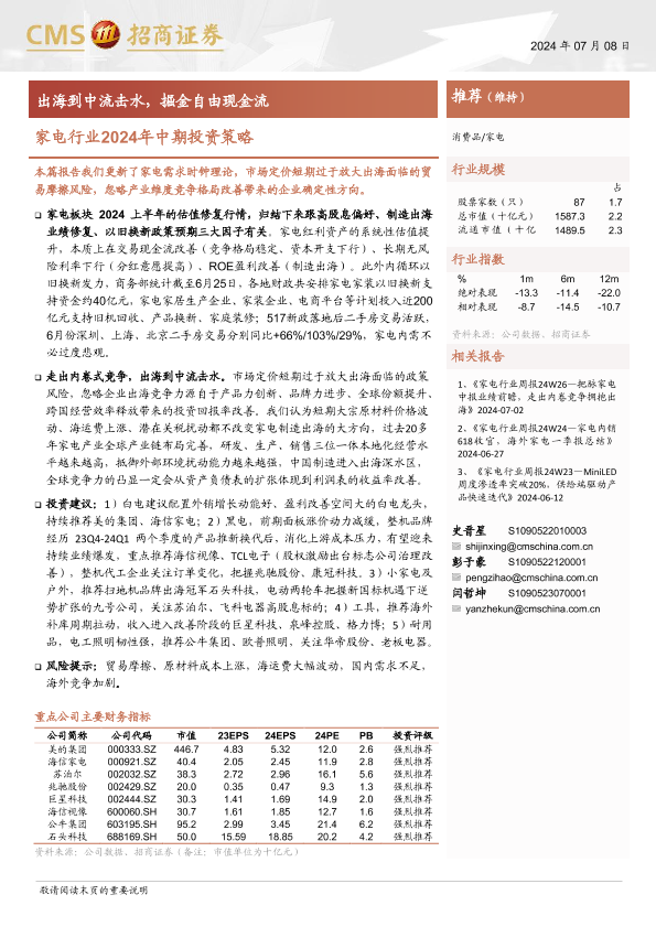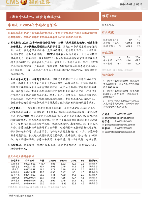 【海通证券】【20240708】家电行业2024年中期投资策略:出海到中流击水,掘金自由现金流-19页