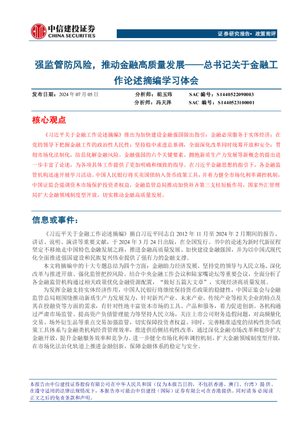 【中信建投证券】【20240705】总书记关于金融工作论述摘编学习体会:强监管防风险,推动金融高质量发展-19页