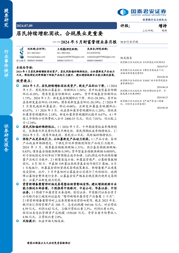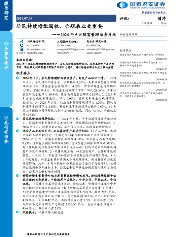 【国泰君安证券】【20240709】2024年5月财富管理业务月报:居民持续增配固收,合规展业更重要-13页