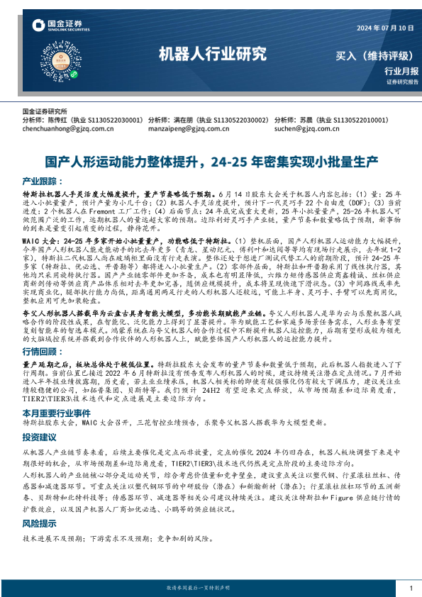 【国金证券】【20240710】机器人行业月报:国产人形运动能力整体提升,24-25年密集实现小批量生产-13页