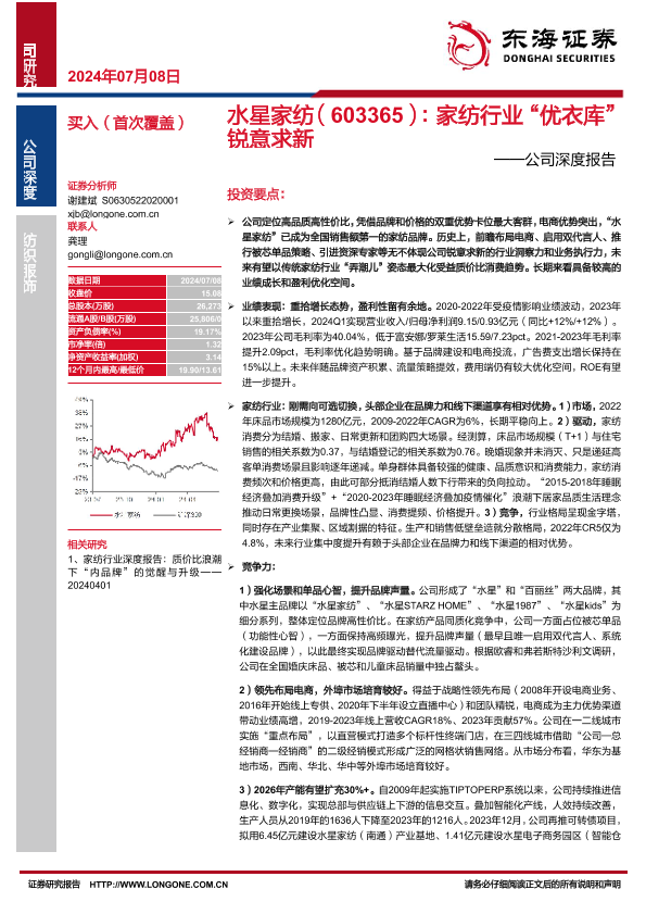 【东海证券】【20240708】水星家纺(603365):家纺行业“优衣库” 锐意求新——公司深度报告-30页