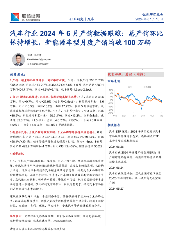 【联储证券】【20240710】汽车行业2024年6月产销数据跟踪:总产销环比保持增长,新能源车型月度产销均破100万辆-10页