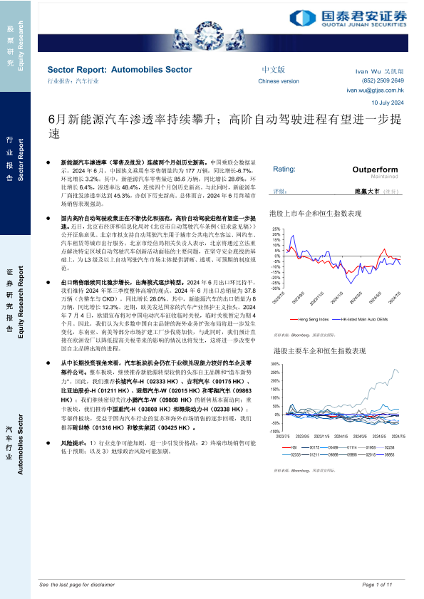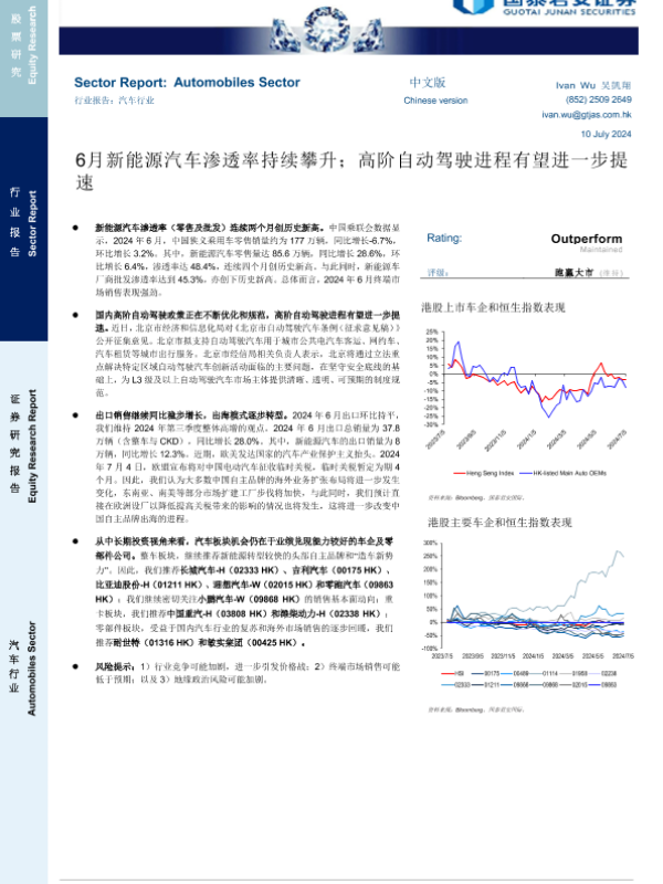 【国泰君安证券】【20240710】汽车行业:6月新能源汽车渗透率持续攀升;高阶自动驾驶进程有望进一步提速-11页