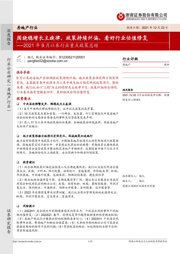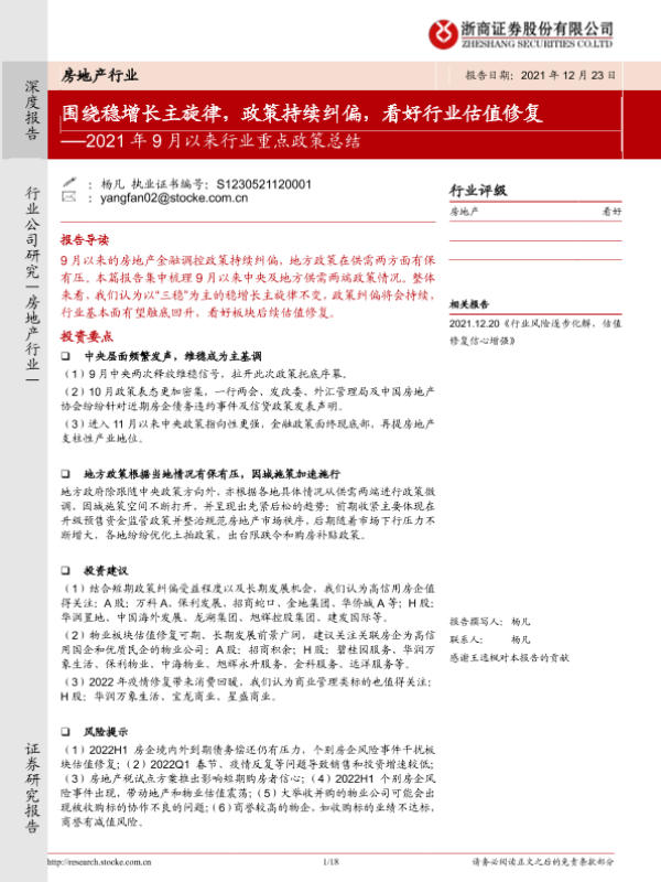 【浙商证券】【20211223】房地产行业2021年9月以来行业重点政策总结:围绕稳增长主旋律,政策持续纠偏,看好行业估值修复-18页