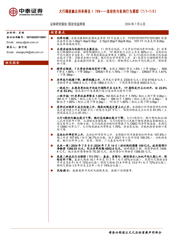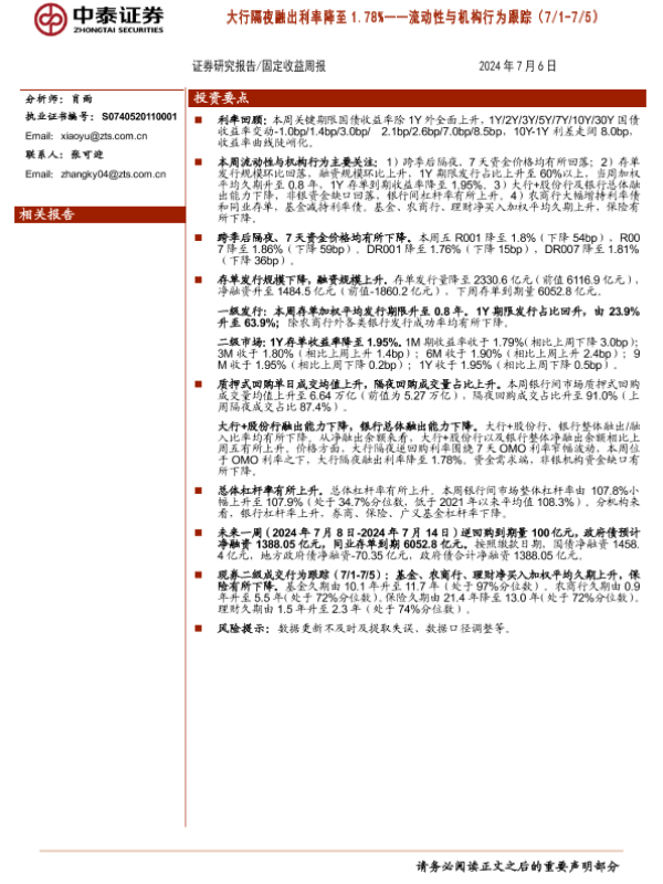 【中泰证券】【20240706】流动性与机构行为跟踪:大行隔夜融出利率降至1.78%-13页