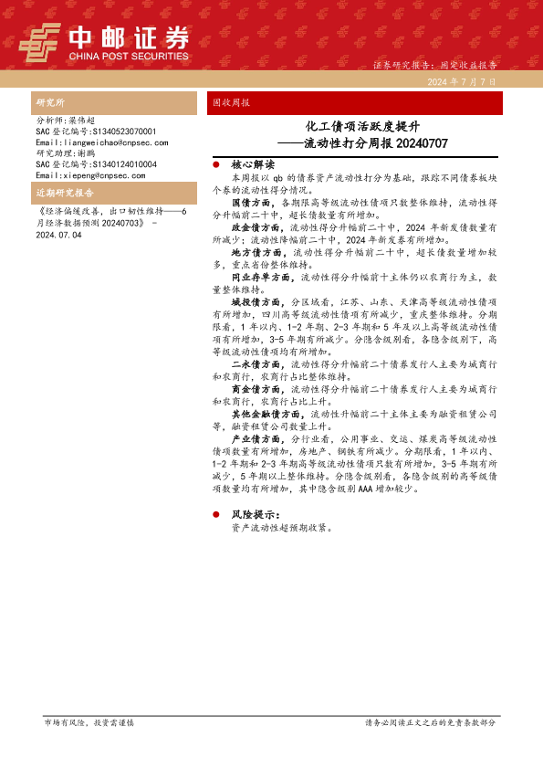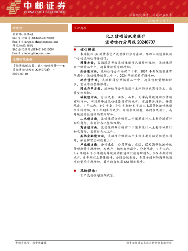 【中邮证券】【20240707】流动性打分:化工债项活跃度提升-38页