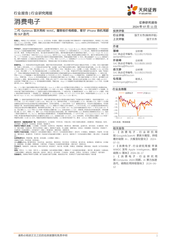 【天风证券】【20240711】消费电子行业报告:二代Optimus首次亮相WAIC,覆铜板价格维稳,看好iPhone换机周期和SLP迭代-37页