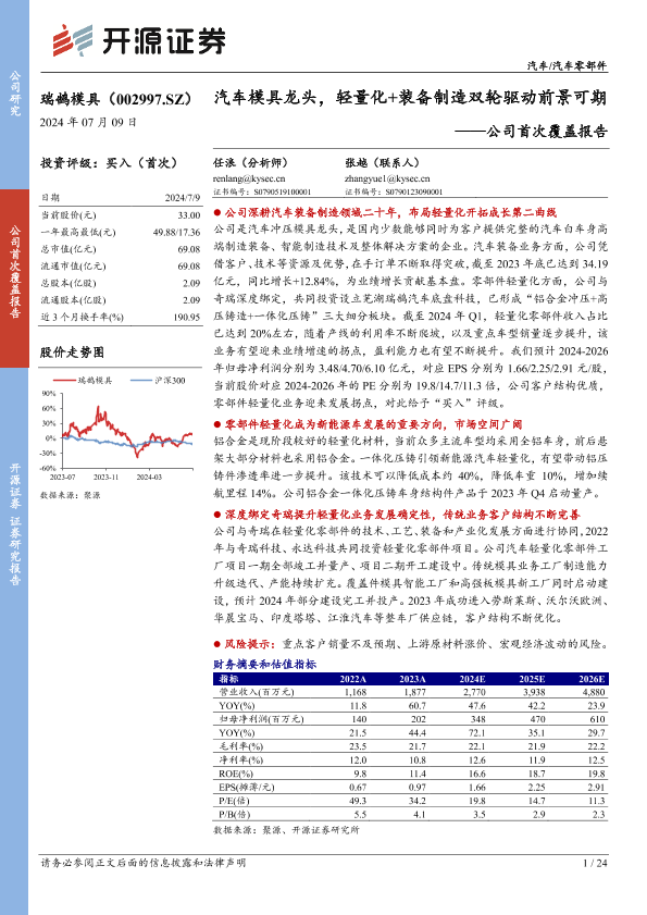 【开源证券】【20240709】瑞鹄模具(002997)公司首次覆盖报告:汽车模具龙头,轻量化+装备制造双轮驱动前景可期-24页