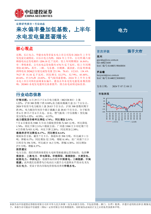 市场表现 投资建议 水电发电量 煤炭价格 电力行业