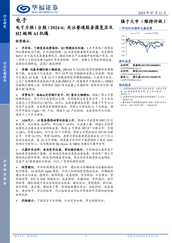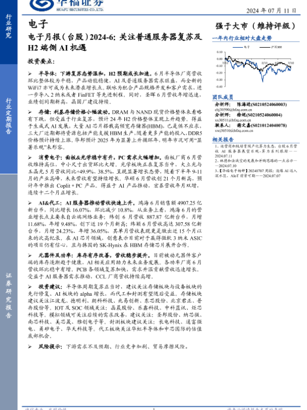 【华福证券】【20240711】电子月报(台股)2024-6:关注普通服务器复苏及H2端侧AI机遇-24页